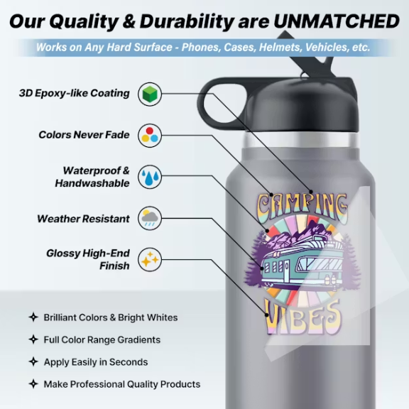 Simply peel, position, and press – no heat press or special equipment required. The strong adhesive ensures long-lasting stick, while the UV-cured ink resists fading, making these stickers ideal for indoor and outdoor use.