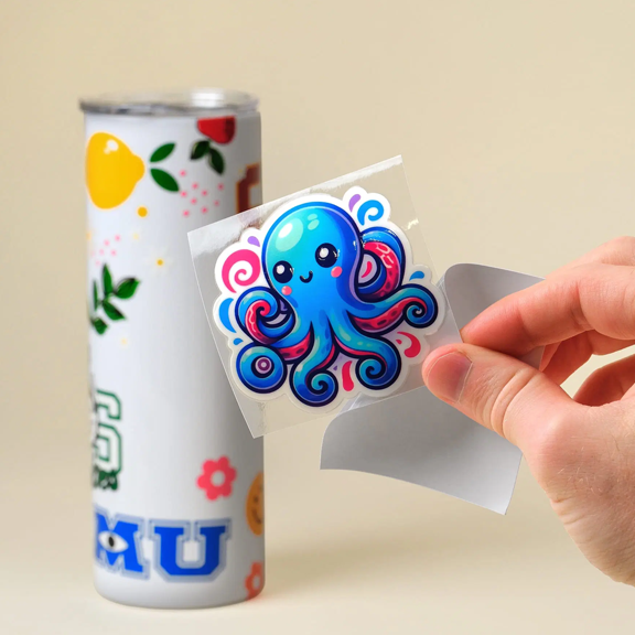 Upgrade your branding with our Custom DTF UV Stickers, printed with high-resolution UV technology for crisp detail and vibrant colour. These UV DTF decals are ultra-durable, waterproof, scratch-resistant, and made to last on a wide range of surfaces – perfect for bottles, tumblers, laptops, packaging, windows, and promotional products.
