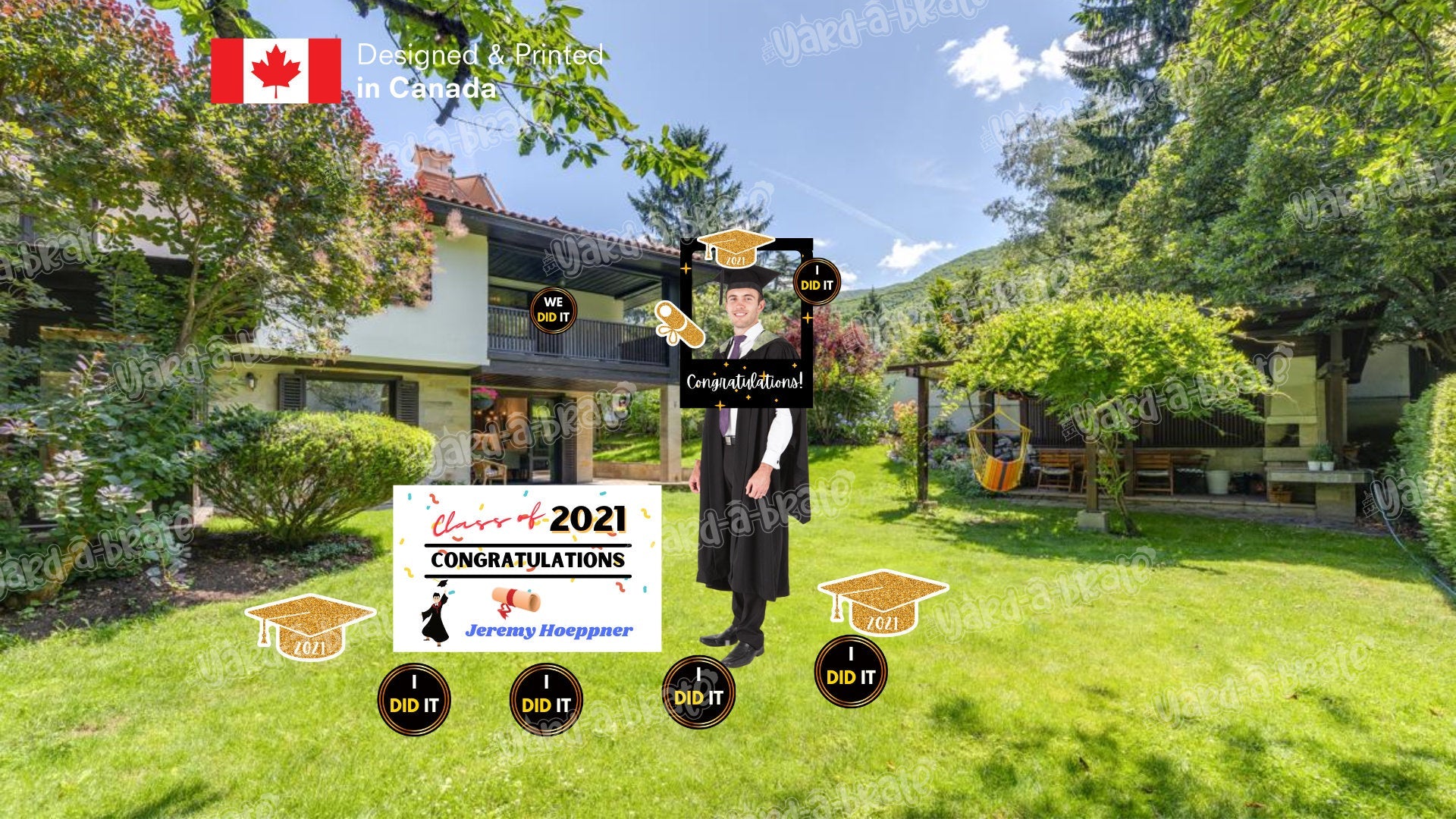 Graduation Yard Sign: 36" wide x 24" tall (for shipping, the back of the sign will be slit and fold in half)