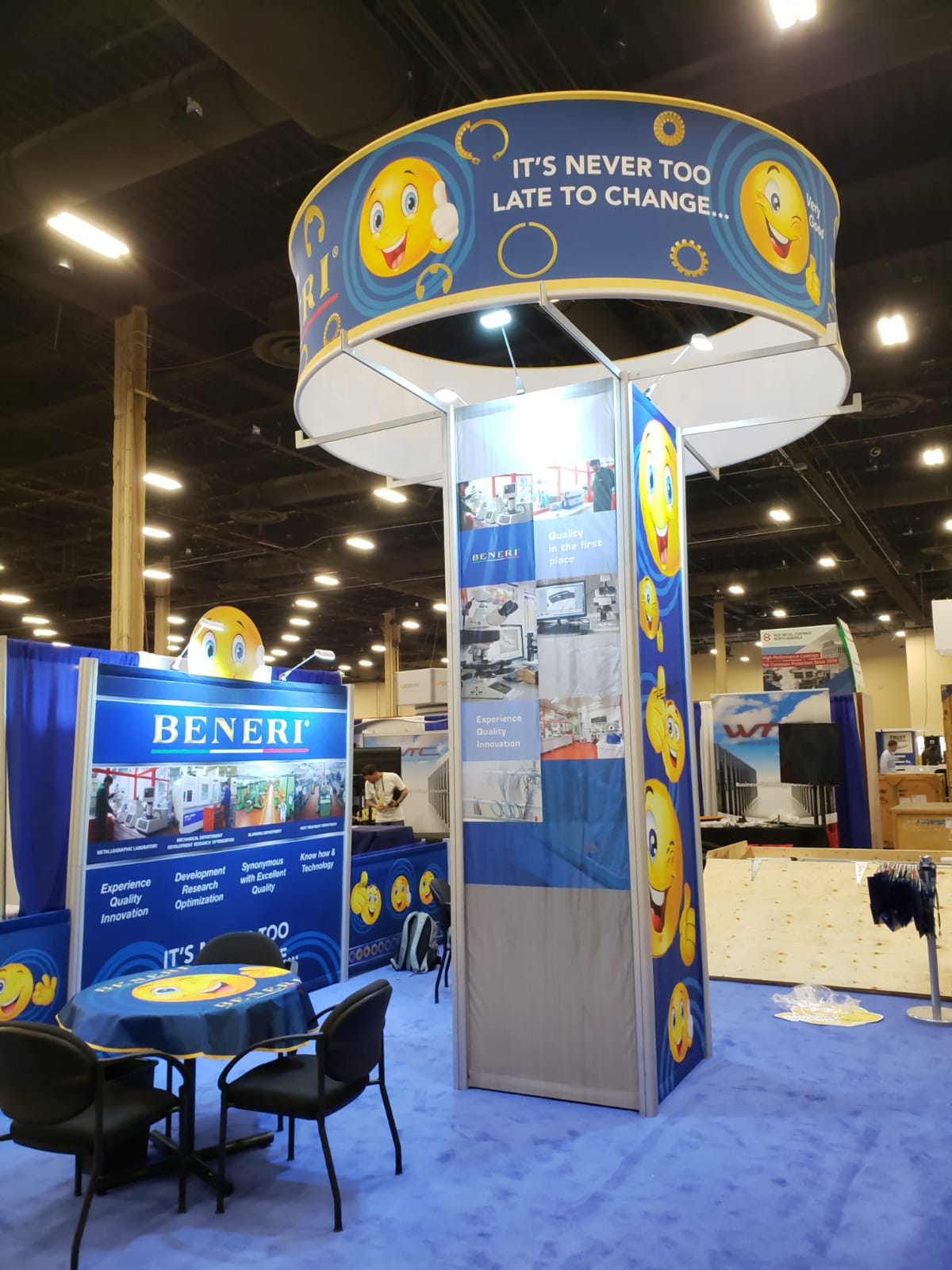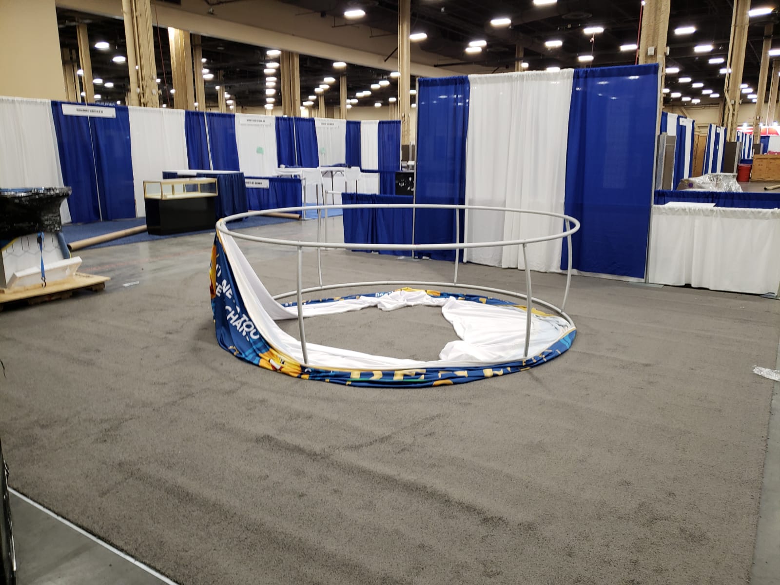 Overhead hanging banners & ceiling sign displays grab attention on the trade show and exhibit floor. Signs suspended above a trade show booth make for a stunning brand display. Quality tension fabric graphics are available in exciting shapes and sizes to meet any trade show booth requirements. Stretch fabric graphics slip over lightweight aluminum tube framing for easy wrinkle-resistant assembly.