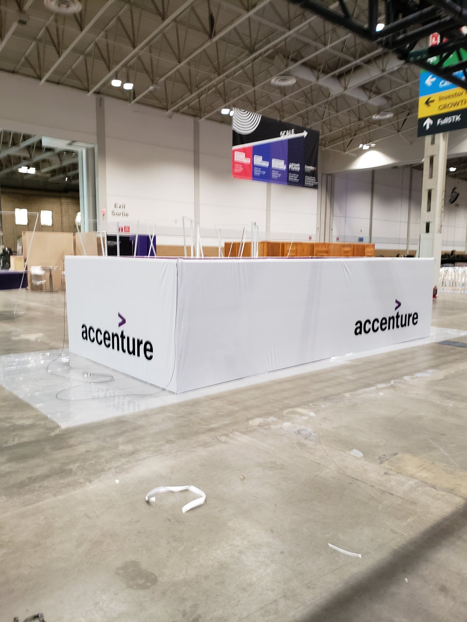 Overhead hanging banners & ceiling sign displays grab attention on the trade show and exhibit floor. Signs suspended above a trade show booth make for a stunning brand display. Quality tension fabric graphics are available in exciting shapes and sizes to meet any trade show booth requirements. Stretch fabric graphics slip over lightweight aluminum tube framing for easy wrinkle-resistant assembly.