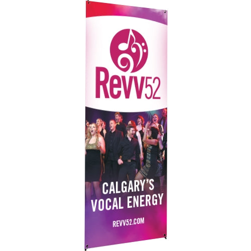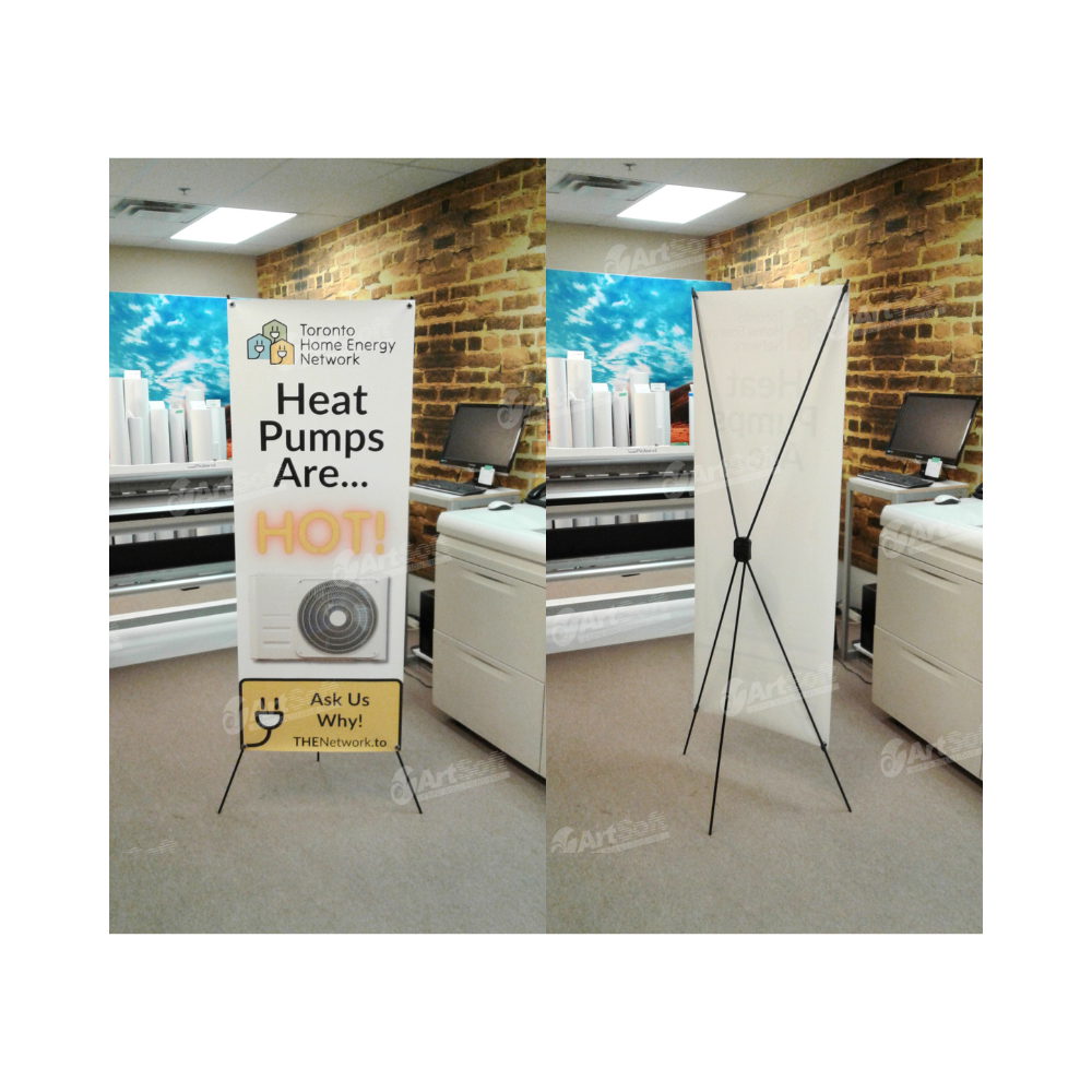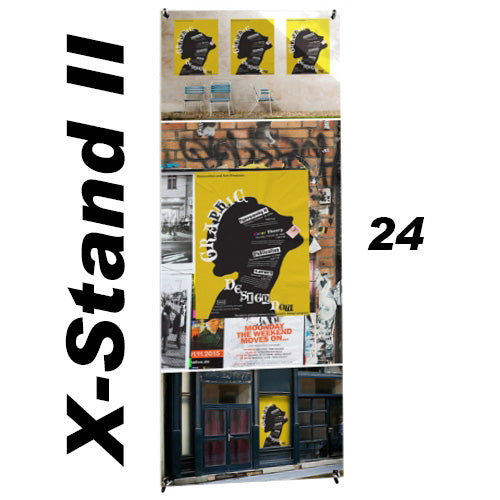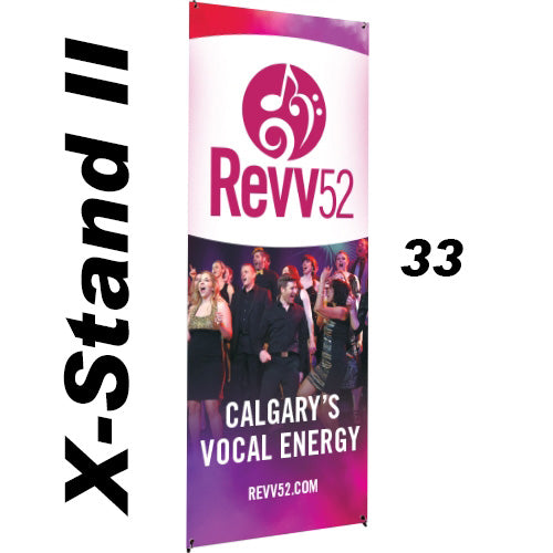 The X-Stand II Banner Stand is an economy spring-back banner stand with a lightweight fold-out X-shape frame and a vinyl graphic with #2 grommets in each corner. The graphics attach easily to the frame for a simple and quick display. Carry bag included.