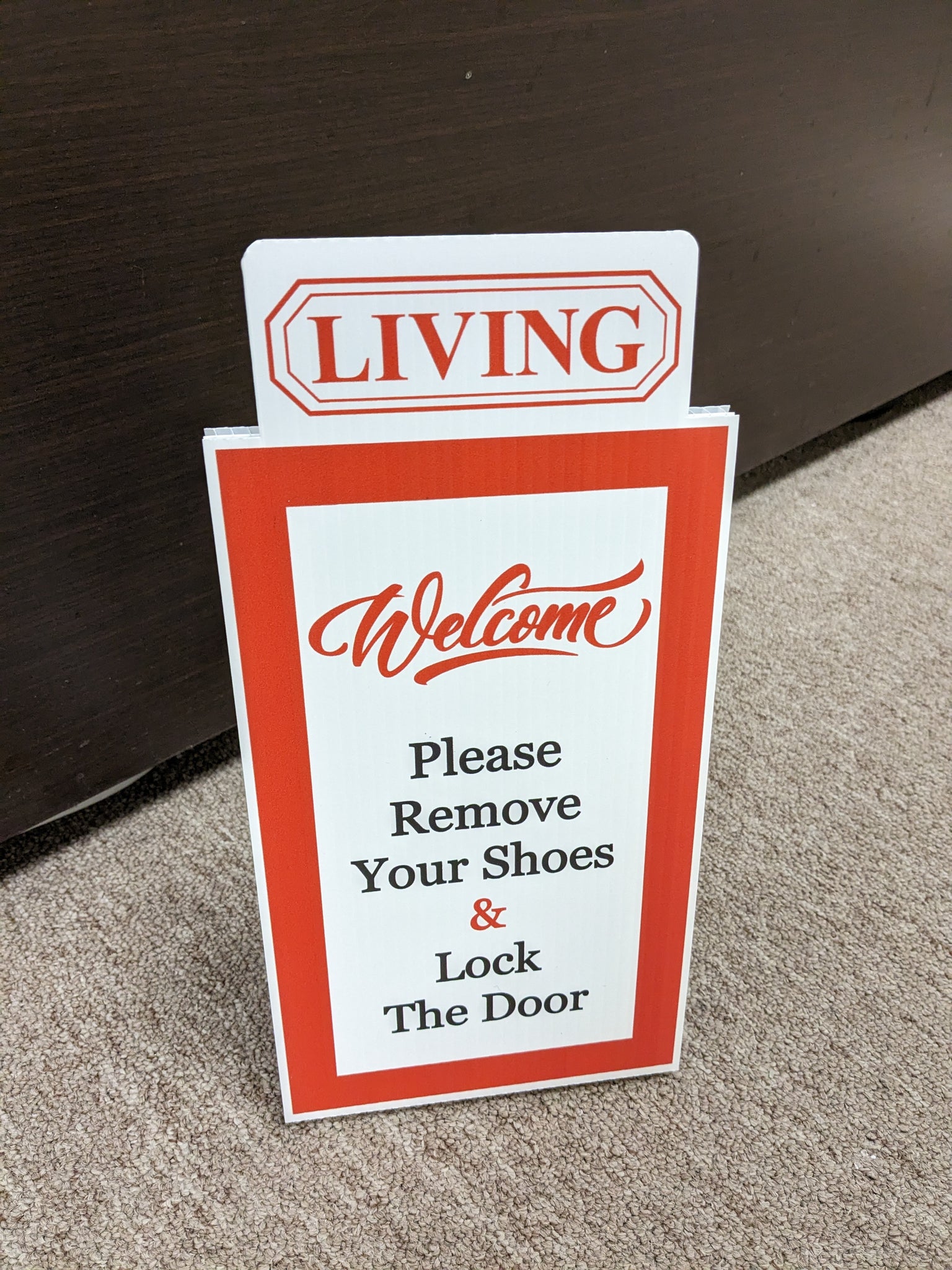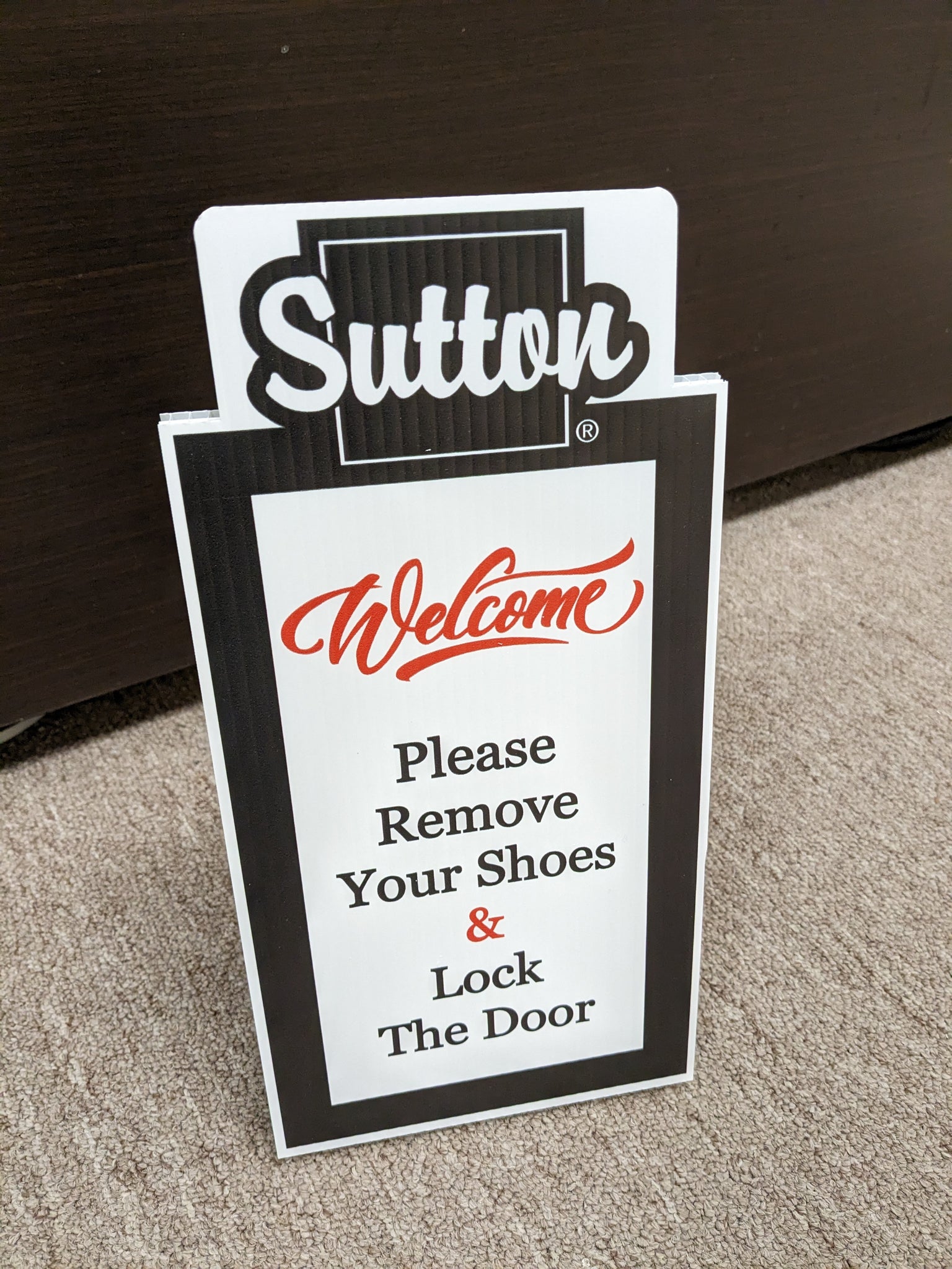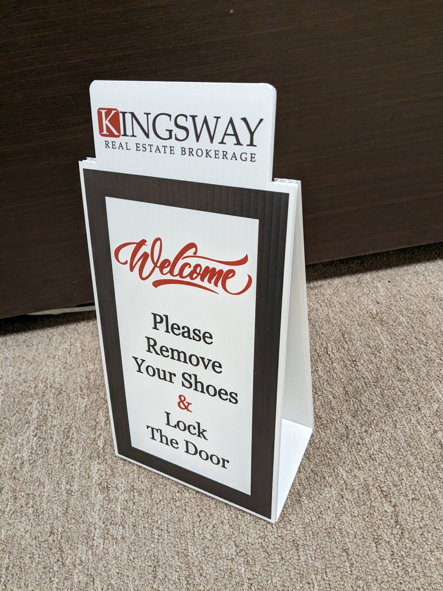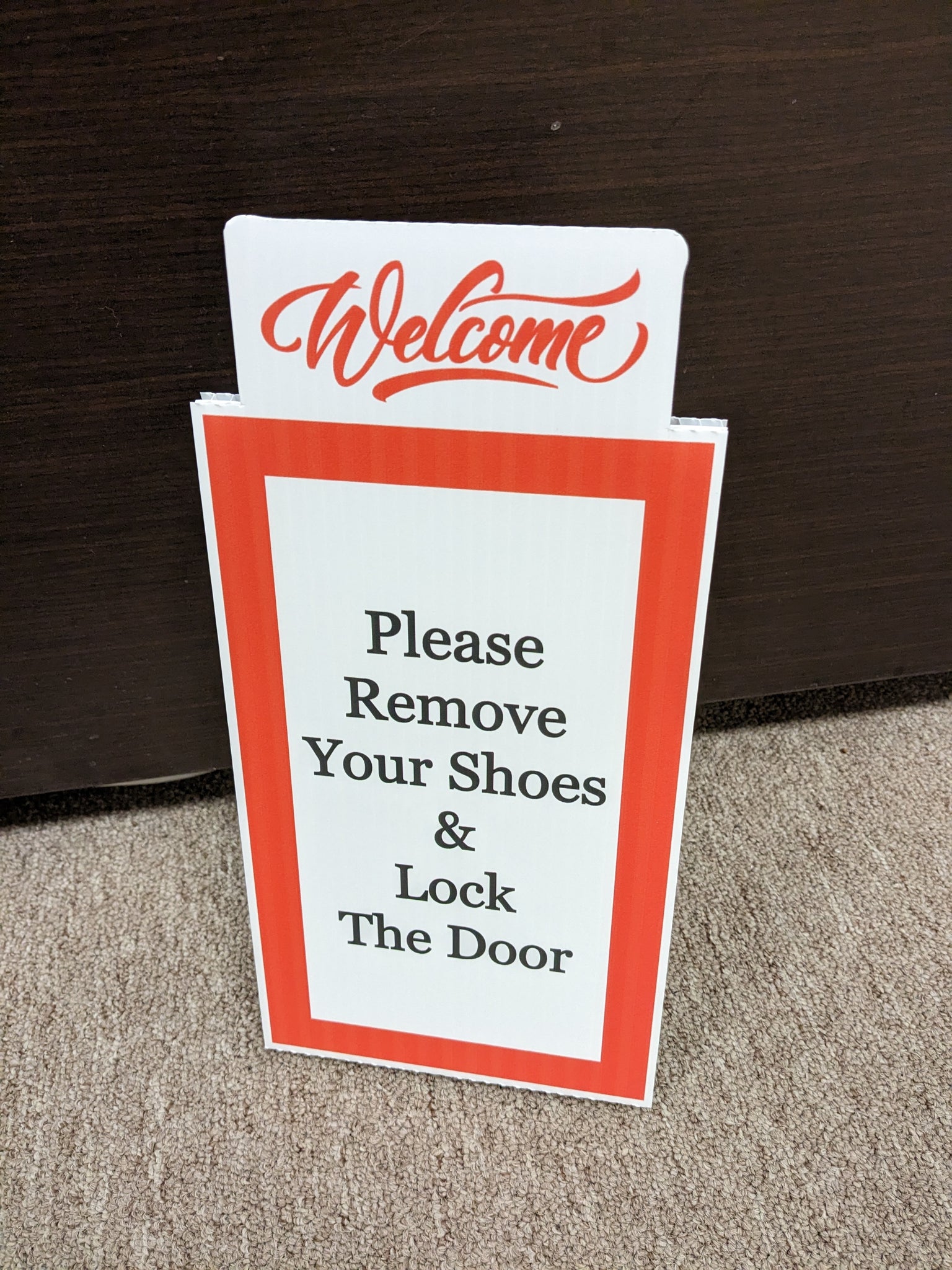 A "Remove Shoes" sign is a subtle yet impactful detail in a realtor's toolkit, fostering a clean and welcoming environment within a listed property. Placed at the entrance, it politely communicates a request for visitors to remove their shoes, preserving the cleanliness of the interior. This sign not only helps maintain the pristine condition of the home but also demonstrates the realtor's attention to detail and commitment to presenting the property at its best. It conveys a sense of respect for the homeowner's space and sets a positive tone for potential buyers, ensuring a favorable first impression during property tours.