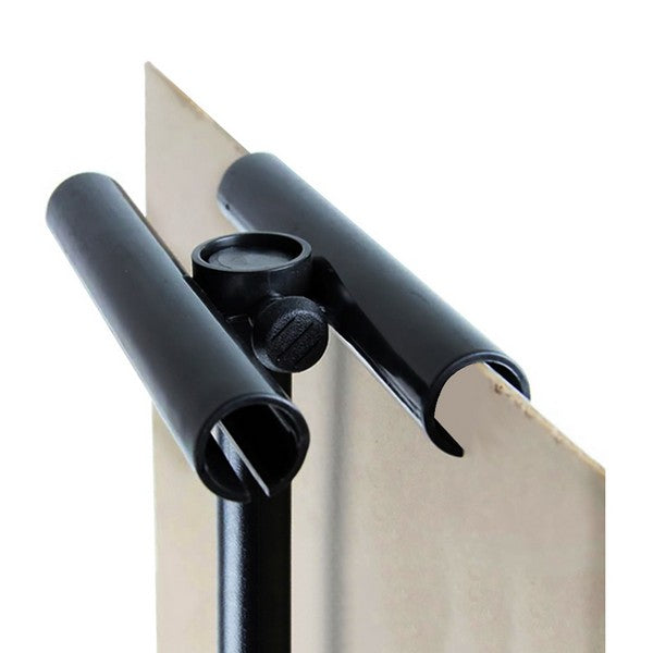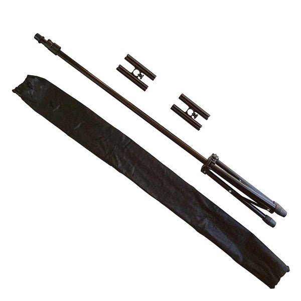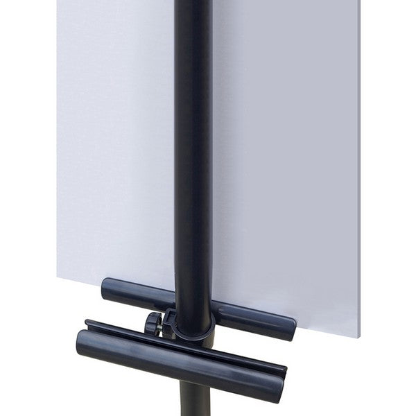 It is manufactured from steel, has plastic connectors and the black finish is powder coated. The folding tripod base and telescopic poles accommodate a variety of graphic sizes up to 1/4” and are sold in a convenient black carry bag.