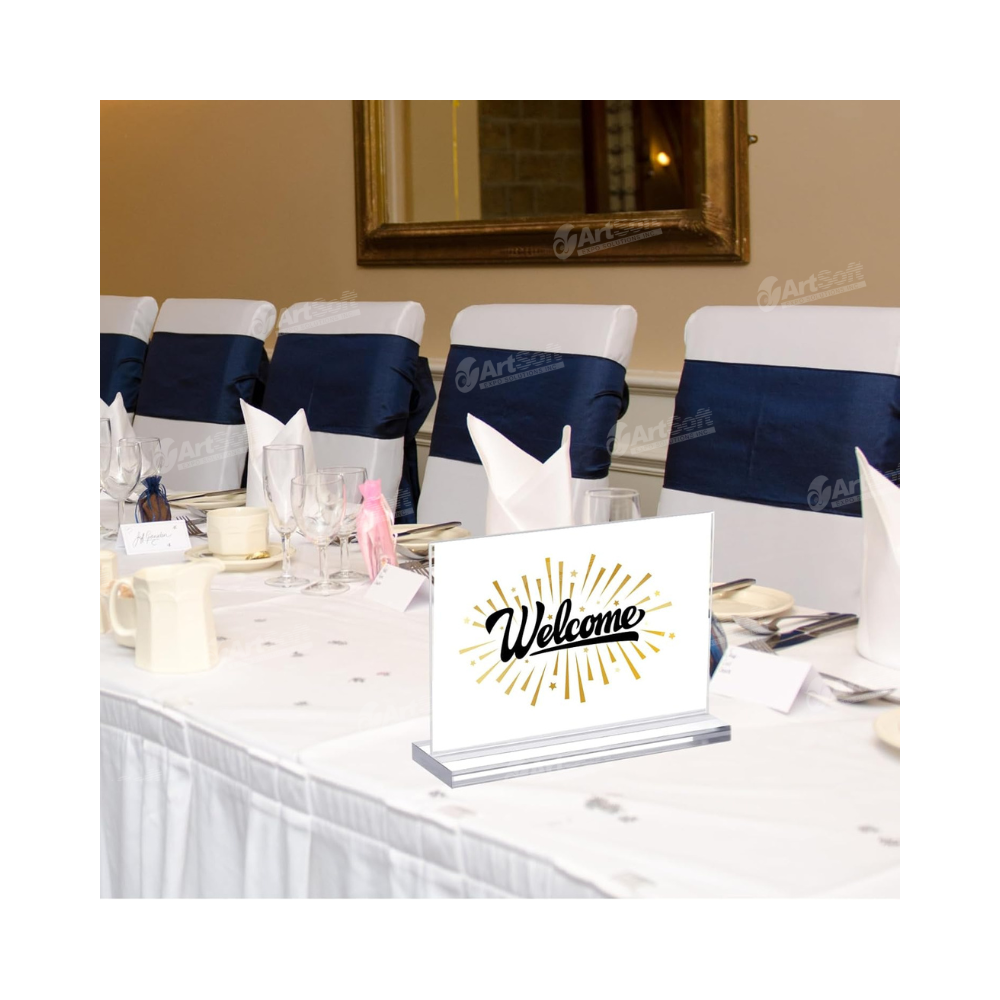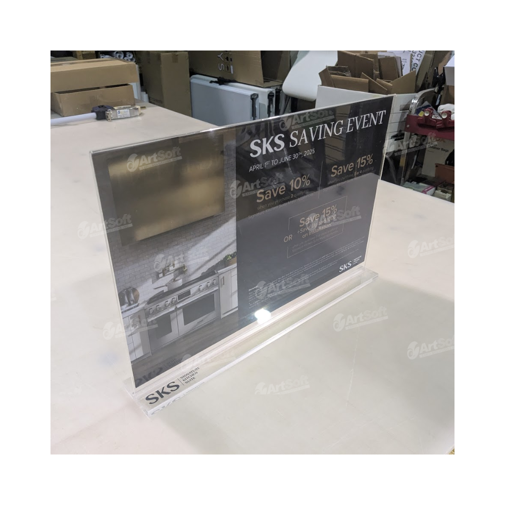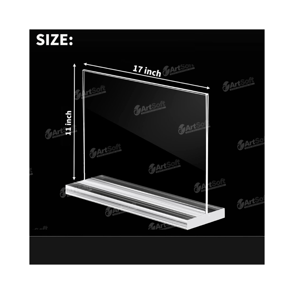 An acrylic tabletop sign measuring 17" x 11" is a versatile and professional way to display important information in various settings. Made from durable, clear acrylic, these signs offer a sleek and modern look, enhancing any office, retail, or event space. The 17" x 11" size is perfect for showcasing logos, advertisements, directions, or safety instructions, ensuring visibility and easy reading. Lightweight yet sturdy, the sign can be easily positioned on desks, counters, or tables. Its clean design provides a polished and eye-catching way to communicate with customers, clients, or guests.